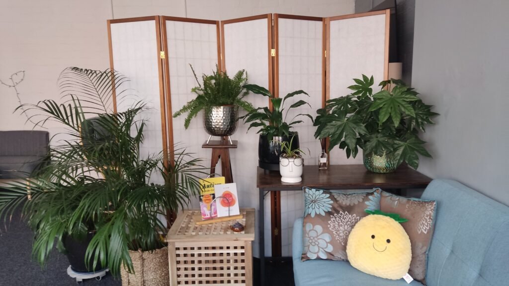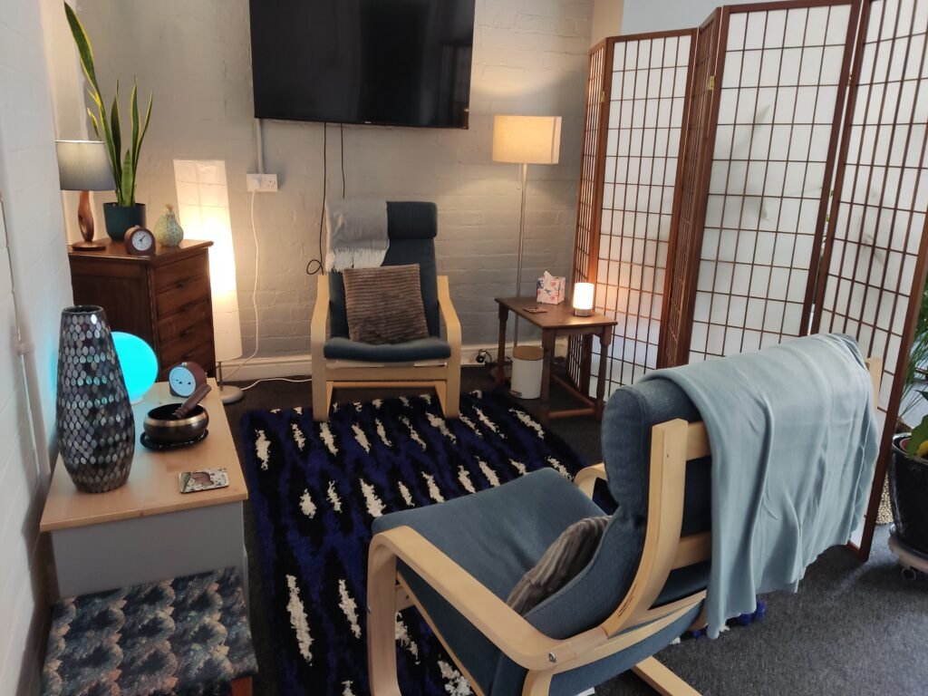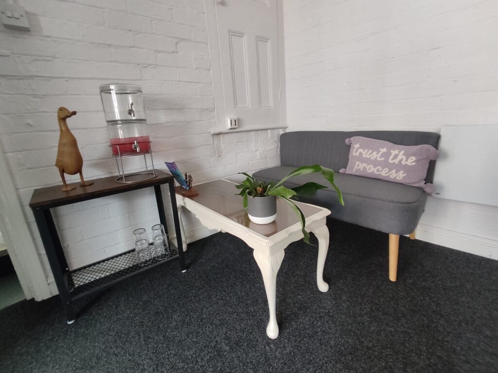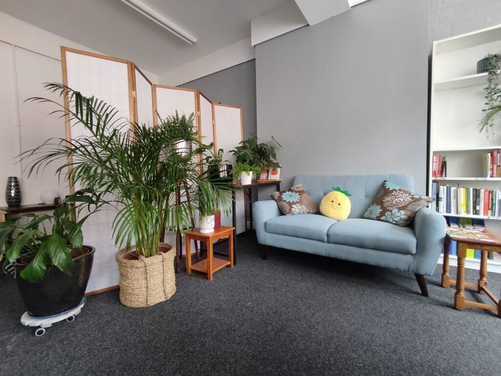 My therapy room at Harland Works, John Street, Sheffield is now available for hire on Mondays. It’s a beautiful, bright room, with spaces for one to one, couples, or group work. It has plenty of room to practice art, play or dance and movement therapy, and includes a large meeting/making table, 2 sofas, and an intimate space for one to one therapy sessions (affectionately known as Therapy Corner).